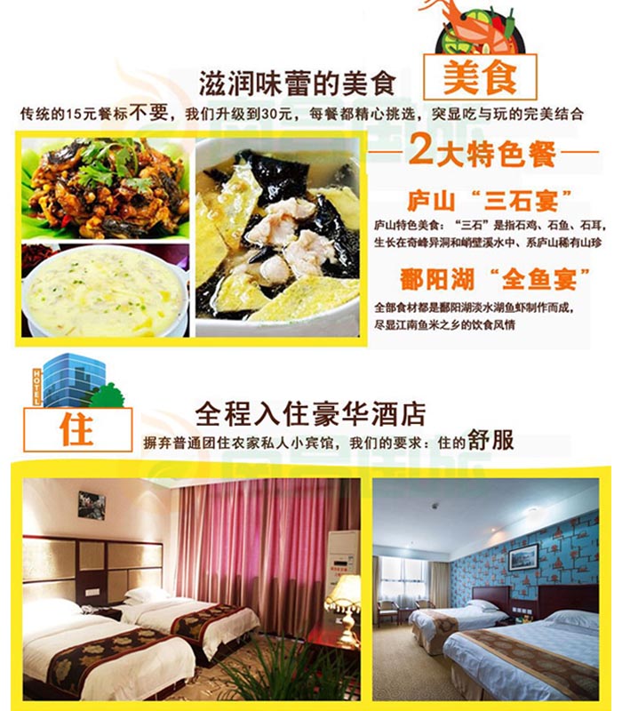 6、 特色安排:庐山三石宴、徽州喜宴特色餐 、专享全程免费提供矿泉水。